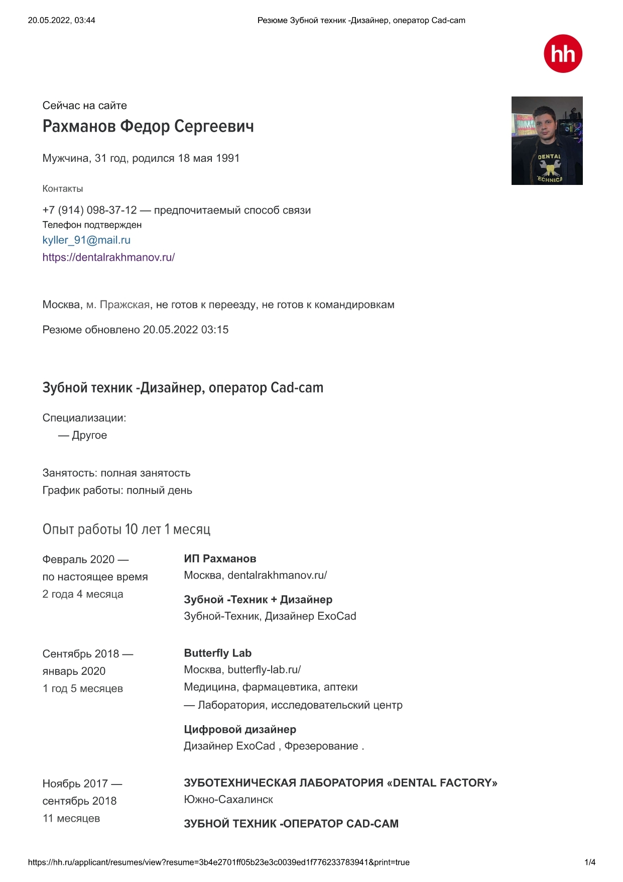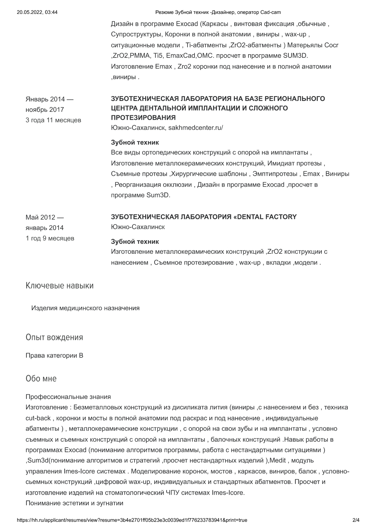 Зубной техник КерамистДизайнерОператор Cad-camОпыт работы