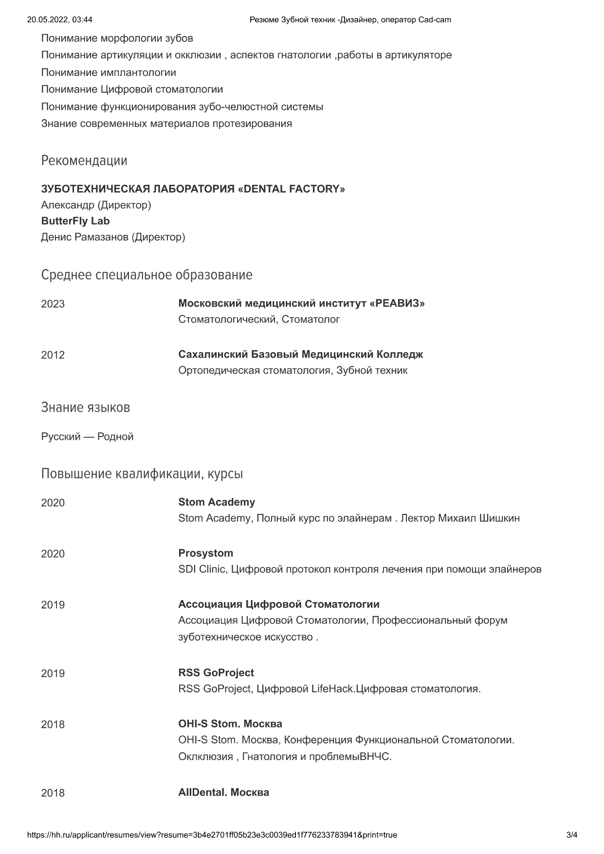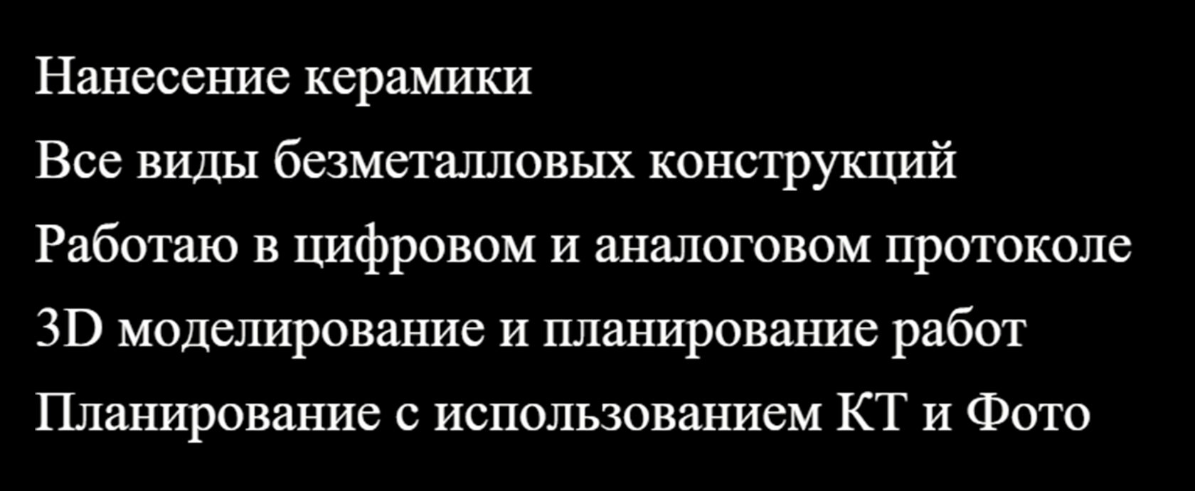 Профессиональные знанияИзготовление : Безметалловых конструкций из дисиликата лития и Zr (виниры ,с нанесением и без , техника cut-back , коронки и мосты в полной анатомии под раскрас и под нанесение , индивидуальные абатменты ) , металлокерамические конструкции , с опорой на свои зубы и на имплантаты , условно-съемных и съемных конструкций с опорой на имплантаты , балочных конструкций .Навык работы в программах Exocad (понимание алгоритмов программы, работа с нестандартными ситуациями ) ,Sum3d(понимание алгоритмов и стратегий ,просчет нестандартных изделий ),Medit , модуль управления Imes-Icore системах . Моделирование коронок, мостов , каркасов, виниров, балок , условно-съёмных конструкций ,цифровой wax-up, индивидуальных и стандартных абатментов. Просчет и изготовление изделий на стоматологический ЧПУ системах Imes-Icore.